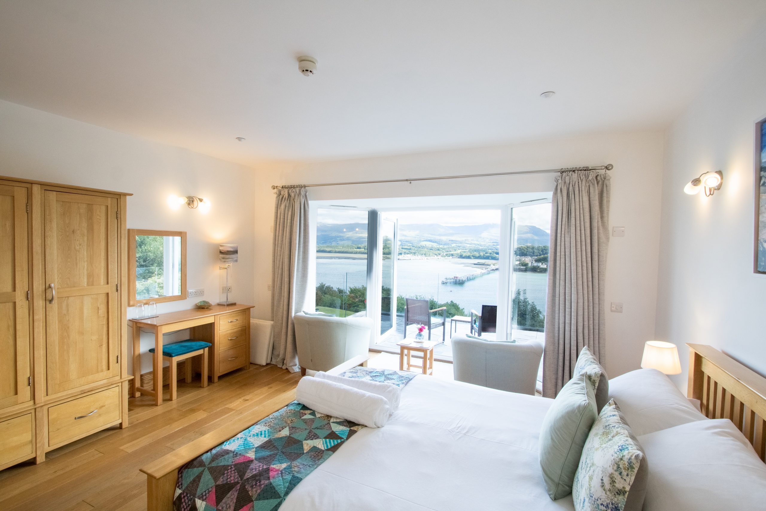 The Guest Room is either available on its own or can provide additional accommodation for those staying in Seascape or the Cottage. It looks out over the lawn and enjoys fantastic views of the Menai Strait and Snowdonia.